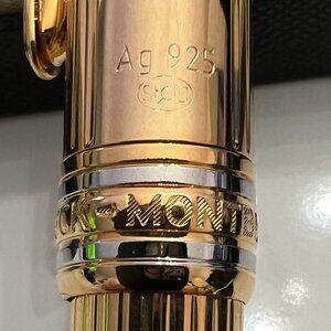 Experience the luxury of writing with a Mont Blanc Sterling Silver Fountain Pen, a testament to exquisite craftsmanship. The pen is elegantly crafted with a sterling silver body, accented by a 24K gold plating that adds a touch of timeless elegance. Its fine nib glides effortlessly across paper, delivering a smooth and satisfying writing experience. Included with the fountain pen is a recently included brand new matching ink bottle, allowing you to immediately begin your writing journey. The Mystery Black ink ensures that your words stand out with a classic, crisp appearance. Whether for daily use or as a collectible, this Mont Blanc fountain pen set is a true masterpiece.