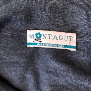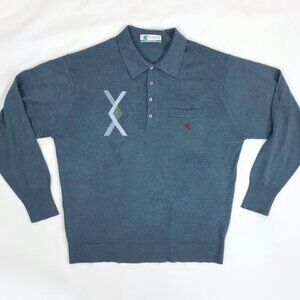 Blue knit polo collar sweater by Montagut Paris. Solid greyish blue with a green and lighter blue diamond/zig zag/x pattern at right chest, also has textured /perforated X or zig zag detail. Button neck, polo collar and long sleeve. Slit chest pocket with red logo. Label indicates 70% acrylic and 30% wool - has a size 5? but please go by measurements below to determine best fit.