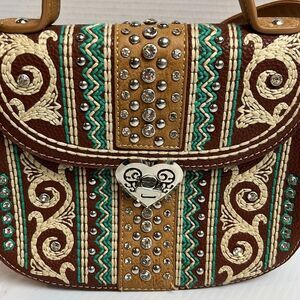 Stylish satchel with intricate embroidery. Features studded details and a heart-shaped clasp. Perfect for any occasion.