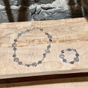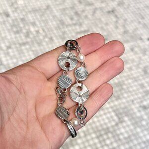 925 sterling silver with Montblanc’s signature engraved star motifs, half moon crescent, and alternating pearls. The set includes a matching necklace (adjustable) and bracelet, both featuring silver circular disks and links of different sizes with wave engravings and lustrous pearls. Each piece has a lobster clasp closure engraved with the Montblanc logo and 925 hallmark. Comes with original Montblanc box and pouch.