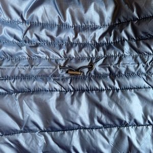 This denim blue puffer coat has a high collar with a hidden hood, two-way zip closure and zip pockets.