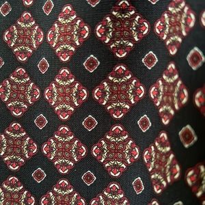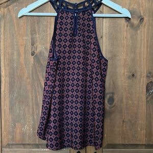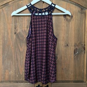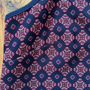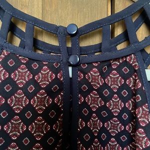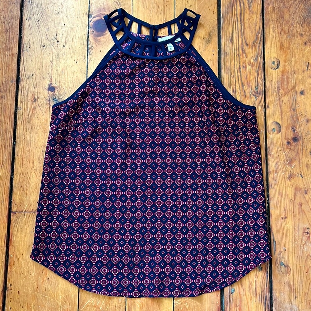 Monteau sleeveless geometric print top in red and navy blue, featuring a ladder style neckline with a 2 button closure at back neckline.