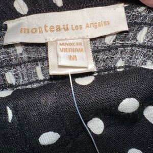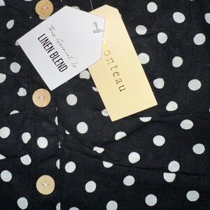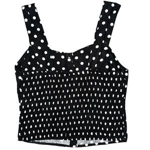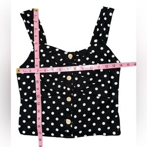 Chic black tank top with white polka dots. Features button front detail. Sleeveless design.