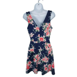 Above the knee, but not mini length dress. Navy background with pink/orange/salmon/green coloured flowers and foliage. Light, swirly fabric.