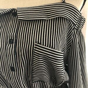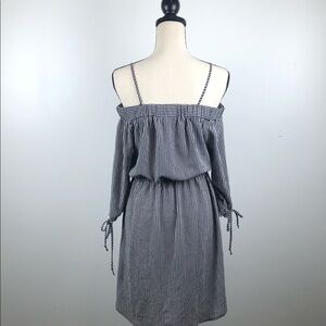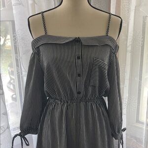 Monteau Los Angeles Black/white striped dress SZ M - Here comes summer, this black and white striped dress is off the shoulder but has two spaghetti straps attached that sit on each shoulder, cold shoulder style. Three-quarter length sleeves with bows at the end of each cuff/sleeve. This dress sits above the knee, lightweight and very comfortable to wear. It also cinches at the waist and has some decorative buttons on the front and a left breast pocket.