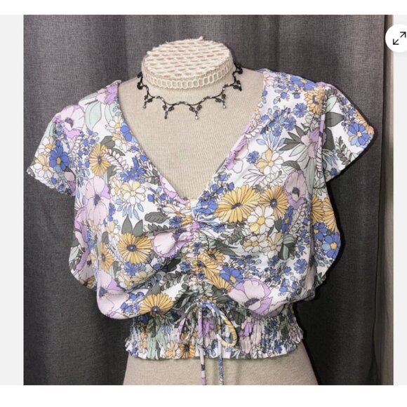 Monteau Los Angeles Floral Print Crop Top w/Flutter Sleeves - Size XS in Pastels