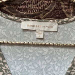 Chic and comfortable, this Monteau Los Angeles dress features a soft olive green base with an all-over cream botanical print. The faux-wrap silhouette includes a flattering deep V-neckline, three-quarter sleeves with subtle elastic cuffs, and beautiful ruched detailing along one side for added shape and texture.