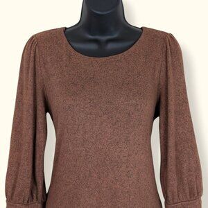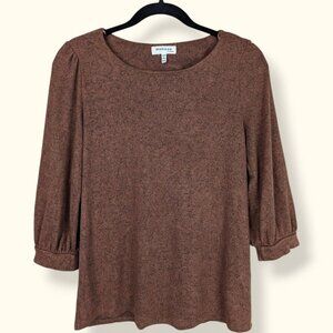 This top by Monteau is made of a very, very soft rayon/polyester/spandex blend (65/30/5). It feels like a microfiber cloth without the part where it grabs your skin, it's just stupidly soft. The top has a round neckline, 3/4 sleeves with small cuffs, and a nice dark orange colour.