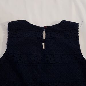 New Monteau girl blue overlay top with tulle bottom trim, top overlay has flower and geometric lines of design, close up shows design well, back has keyhole and button closure