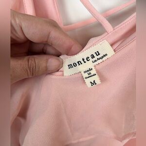 Monteau pink dress, Medium, vneck with ruffles, back straps & vback with ruffles, elasticized waist, tiered layer on skirt. Flowy, chiffon outer layer, over lining. Excellent preowned condition