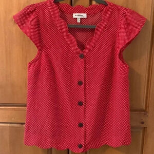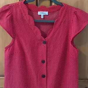 Red with white polka dots! Capped sleeves, V neck with scalloped edge around neckline and front with buttons. Size small.