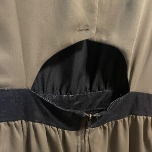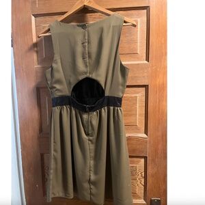 Monteau lined army green mini dress. Back is open in lower back. Buttons on upper, zipper on lower - black accents