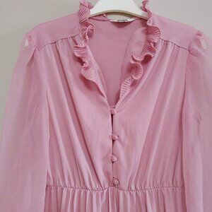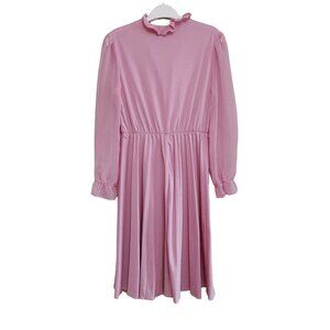 Montgomery Ward Vintage According Pleated Ruffle Button Up V Neck Pink Dress Siz