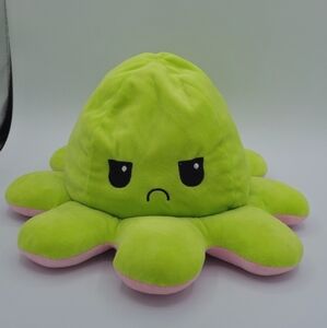Soft, plush, reversible, happy & angry face octopus that's both green on one side & pink on the other.