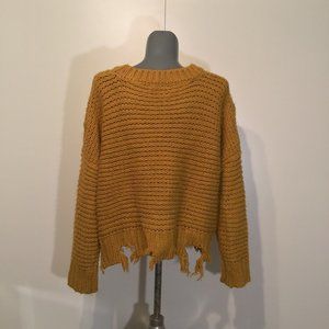 Oversized, chunky cable knit, crew neck sweater with distressed hem in a gorgeous mustard yellow.