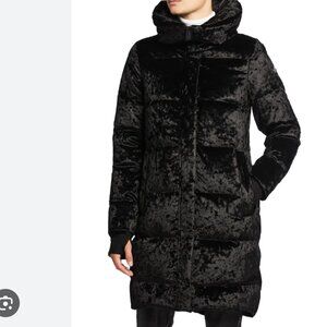Alcester Crushed Velvet Puffer Jacket in Black. Never worn. Comes with original tags, custom hanger and wardrobe cover. XL but fits smaller.