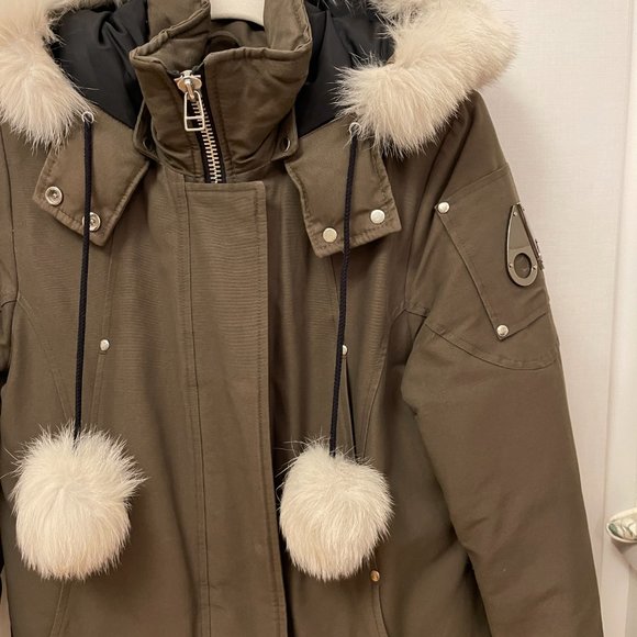 Dark green Moose Knuckles down coat with fur trimmed hood. Hits upper/mid thigh, slightly longer at the back. Size medium.