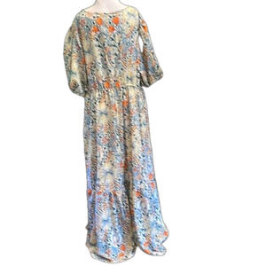Beautiful floral short sleeve maxi dress with lower flounce and 1/2 length puff sleeves