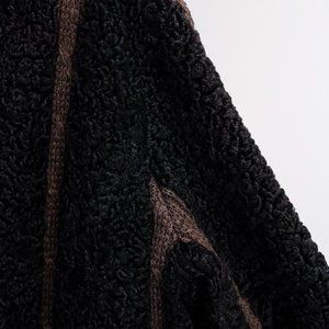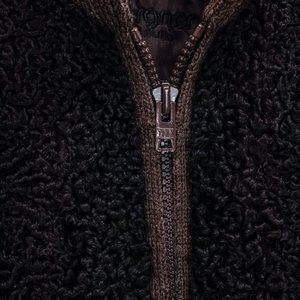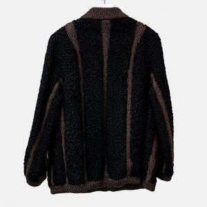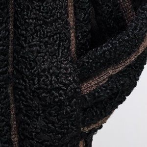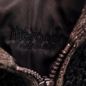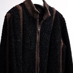 A zip-up bomber jacket from German brand Morgner, composed black Persian lamb wool panelling and brown knitted trimming throughout. This unique jacket features a brown standing collar, a zip-up front, long sleeves, gathered cuffs, a pair of side slip pockets, and a brown lined interior embroidered with the initials “W.S.” on the interior. Size: See measurements Condition: Excellent; minor piling Approximate Measurements (Laid flat): Shoulder: 16.25” (41.5 cm) Chest: 16.5” (42 cm) Waist: 21.25” (54 cm) Sleeve: 24.5” (62 cm) Length down back: 28.5” (72.5 cm) Composition: Persian lamb