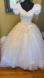 Stunning white ball gown with lace details and puff sleeves. Perfect for formal occasions. Early 90’s vintage. Size XS. I could not zip it up on my size 6 mannequin. Therefore, I recommend that you be size 4 or smaller to fit this exquisite gown. There is one hole that I could find in the tulle. Back of gown bustles easily, allowing this to also work as a white ball gown. Tulle with faux pearls over satin lining.