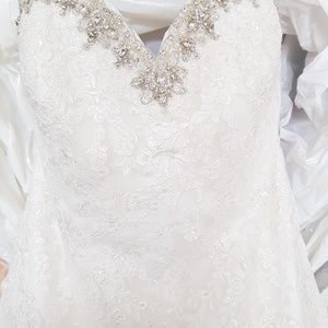 Worn once and was professionally dry cleaned and stored in dust bag since. White and Size 12 but I had it taken in to an 8. It has since been taken back out to regular size.