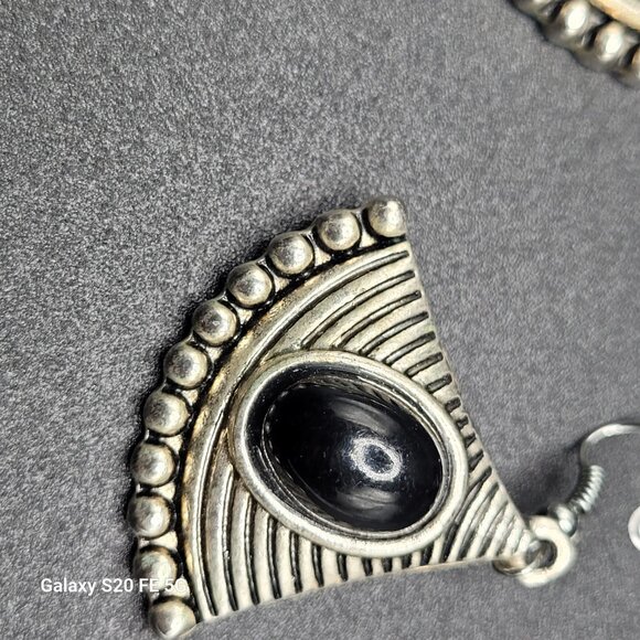 Silver Fan Earrings with Black Stone. All handmade. Attached to fish hook clasps.