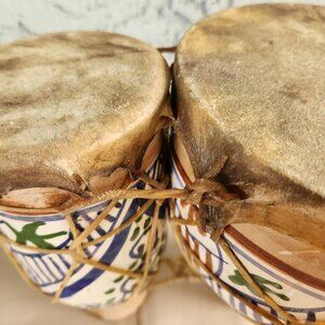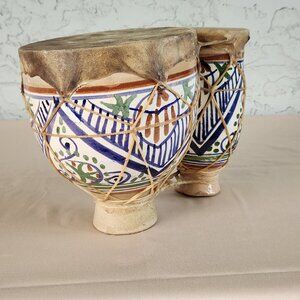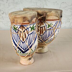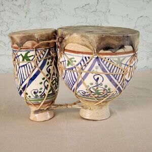 Moroccan Hand-Painted Ceramic Bongo Drums with Goat Hide – Handmade Folk Art