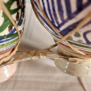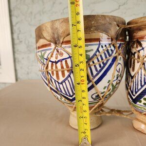 Authentic vintage Moroccan hand-painted ceramic bongo drums, featuring natural goat hide drumheads and sinew lacing. These artisan-made, functional double drums display traditional Moroccan artistry with vivid blue, green, and terracotta painted designs.