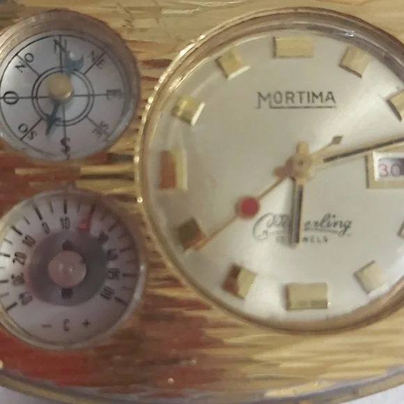 The larger dial is the mechanical watch. The winder head is missing. A 17 Jewel watch with a red marker dot on the second hand. The 2 smaller dials make this watch unique and special. The top dial is a compass the lower is a thermometer. All these dials are encased in a glorious gold case with a wave pattern.