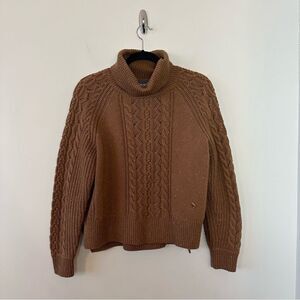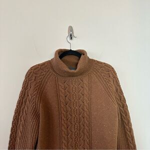 This soft cable knit wool sweater is designed to keep you warm when the temperatures drop. The casual box fit is finished with ribbed trims and rolled turtleneck. We love it tucked into a swishy pleated skirt or dressed down with your favorite jeans.