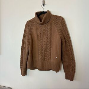This soft cable knit wool sweater is designed to keep you warm when the temperatures drop. The casual box fit is finished with ribbed trims and rolled turtleneck. We love it tucked into a swishy pleated skirt or dressed down with your favorite jeans.