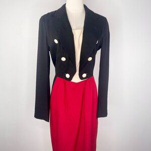 ⋆ A vintage 1990s Cheap and Chic by Moschino dress, featuring a playful, avant-garde design that cleverly mimics the look of a red shirt, beige vest, and black tuxedo coat. Its bold, whimsical style evokes the charm of a circus ringmaster or the iconic look of Mickey Mouse, making it a standout piece from the brand’s imaginative collection.