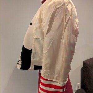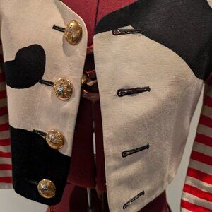 A beautiful silky feel Moschino Bolero cropped Jacket. Vintage, bought in early 1990s. Made in Italy. Size USA 4. Sleeves can be worn at three quarter, or folded at elbow. Hook eye closure. Moschino branded removable hook buttons. Lightly padded shoulders. Silk lining. Off white base with black motifs and red stripes on the sleeves.