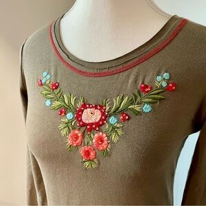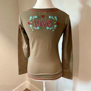 Moschino Y2K Floral Embroidered Long Sleeve Top. Brown with colorful embroidered flowers on the front and the word love on the back. Cotton/lycra blend. Size 4. Excellent condition.