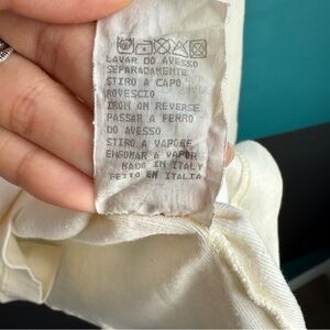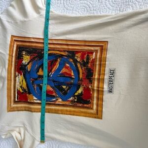 White long sleeve tee. Features vibrant peace symbol design. Bold colors add style.