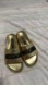 Chic Moschino slides in metallic gold. Features bold black branding. Authentic and Gorgeous!! Worn only twice. Slight stripping at front of slide, however not noticeable at all.