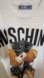 White tee featuring a teddy bear in a black leather jacket. Bold Moschino logo on top.