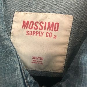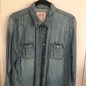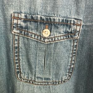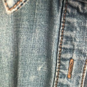 This long-sleeved denim shirt is made of distressed fabric (see close ups of some typical white marks) and features front pockets and a collar. As new condition. Size XXL. Measurements: 23" armpit to armpit, 25" long