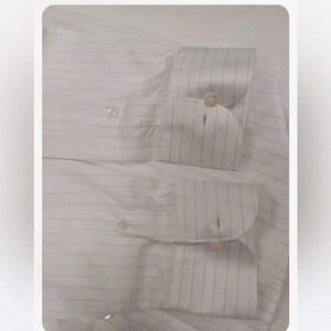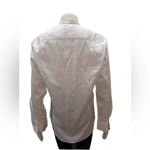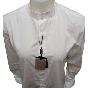 White with grey pin stripes, it has a band collar and two spare buttons. Perfect for special occasions or for the office.