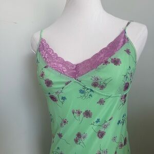 Step into a dreamy early-2000s fantasy with this Motel floral lace slip dress, a lush blend of whimsy and allure. The soft mint green base is kissed with violet rose blooms and trimmed in lavender lace, creating a palette straight from a nineties teen movie or a fairytale garden party.
