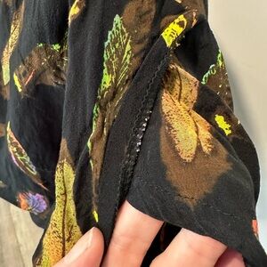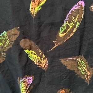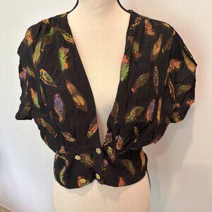 Motel Rocks Black Multi Color Feather Print Crop Top Flutter Sleeve M EUC