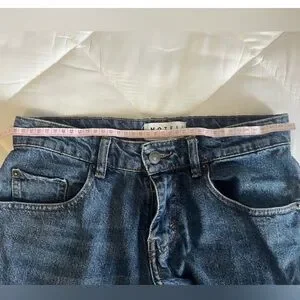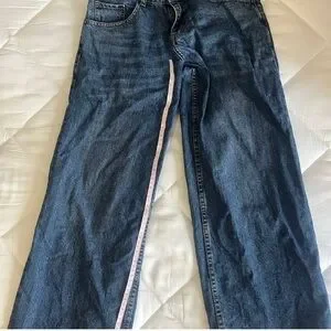 Classic blue denim jeans. Features button closure. Stylish and versatile.