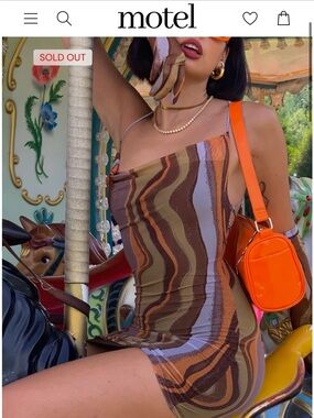 Motel Rocks dress with brown body and rust-toned mesh panels. Slim straps and fitted silhouette. Lightweight, semi-sheer paneling creates contrast. Modern, versatile piece for day or night.