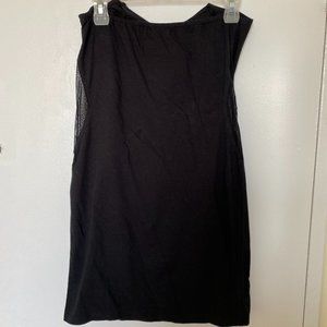 Black strapless dress with mesh cutout sides.