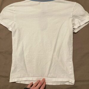 Motel Rocks Cropped White Tee with Sky Blue Neckline, Cut Out and Bow