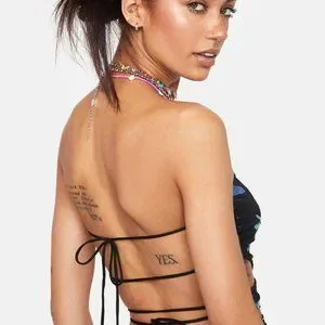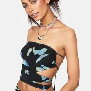 Look cute in the Ersa top. This black and blue butterfly printed top features a cropped fit with cutout detailing to the front, square neckline and corset style tie back. Style yours with a heeled boot for a Y2K look.