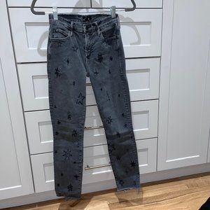 Mother Denim DoubleFay Charmer Size 25. Wash: In The Stars. Super comfy, super stretchy jeans with fray detail at the bottom and on the waist. Star print!