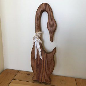 Hand made wooden mother goose wall hanging with beige ribbon around the neck. Has hanger on the back. 17" tall x 5 1/4" wide x 1" thick. Pre-owned condition, some surface wear to wood, ribbon has a few marks & glue residue (ribbon could be removed/replaced).