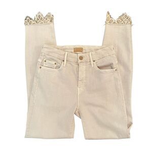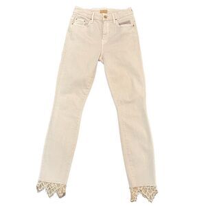Mother Jeans High-Waisted Looker Dagger Ankle Fray “Pretty Just Strolled In The City” Blush wash. Women's 25. Floral lace trim. Skinny. Very light pink jeans. Stretchy. Zip up fly with button closure. Very good used condition. Please see photos for approximate measurements.