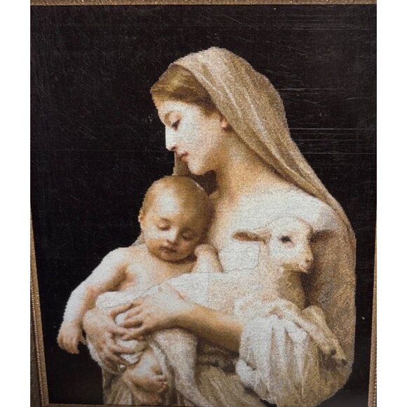 A sophisticated counted cross-stitch pattern featuring Mother Mary holding Baby Jesus and lamb. Designed for advanced crafters seeking intricate and detailed projects.